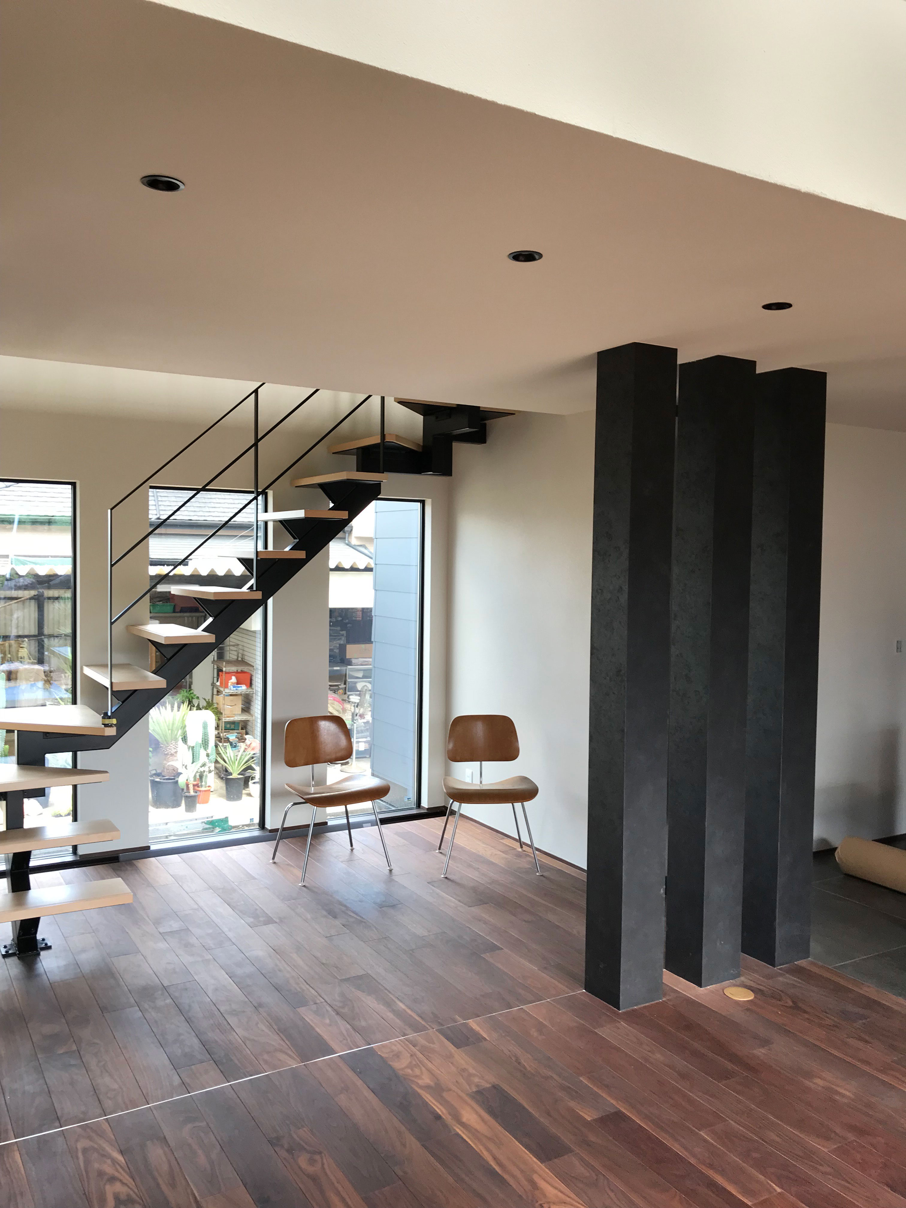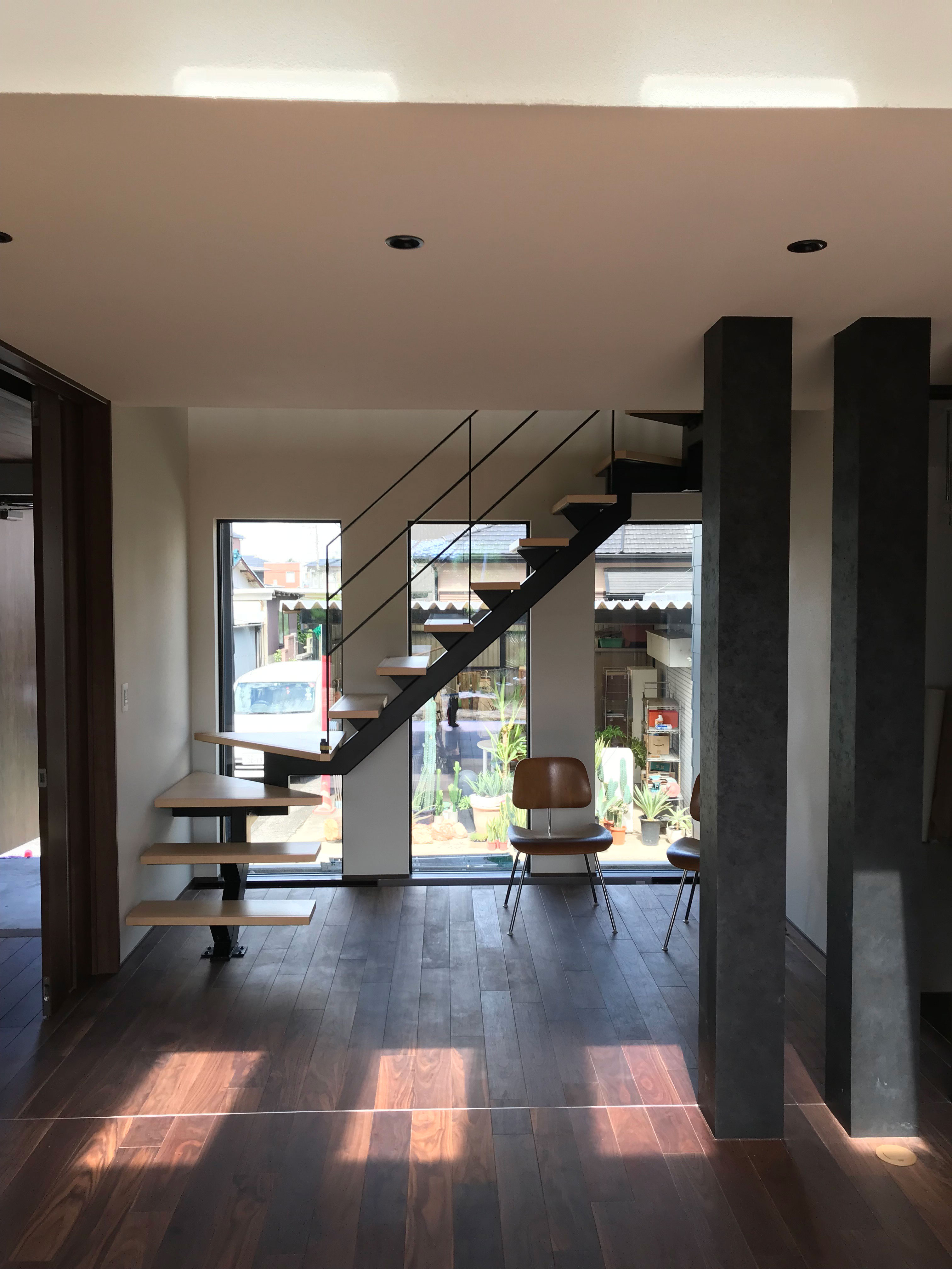 > 縦窓にクロスするデザイン階段